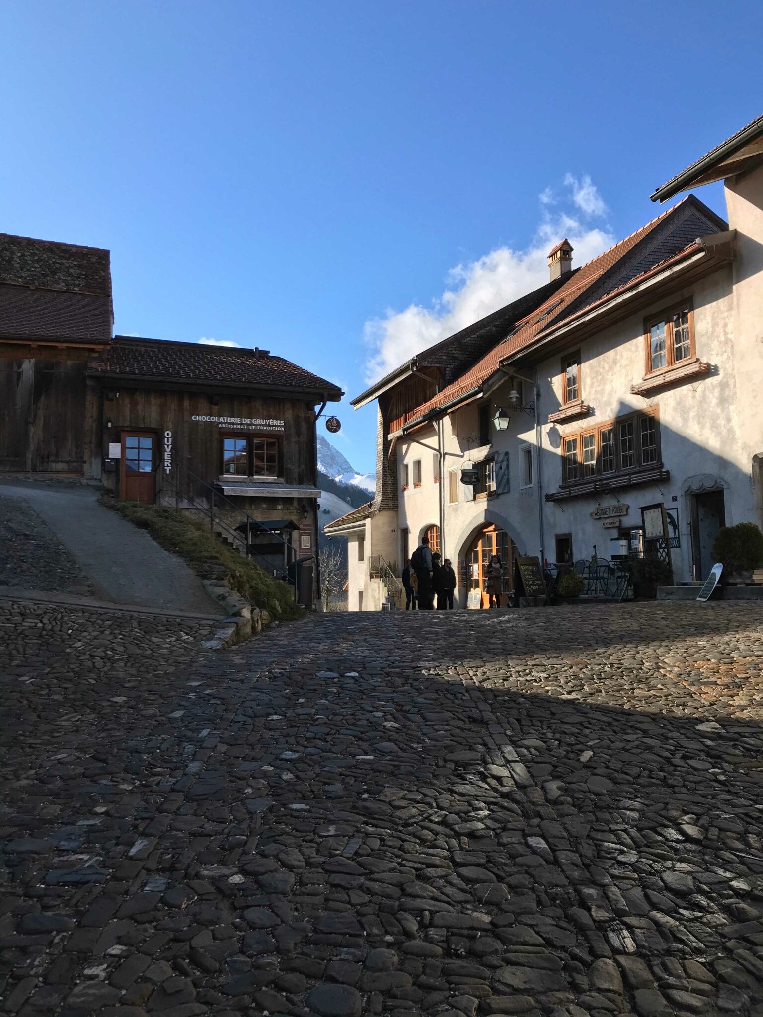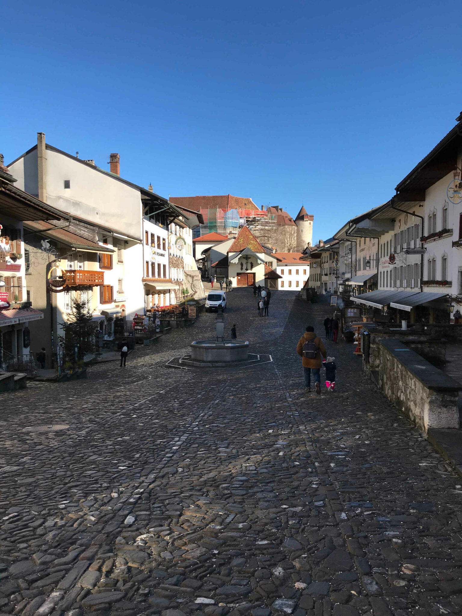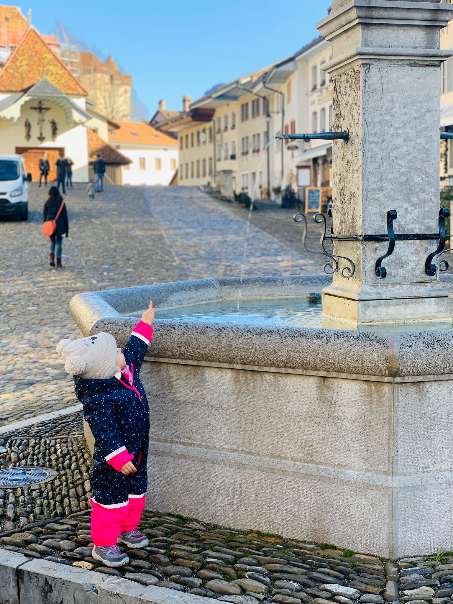 De Bulle, seguimos com outro trem até a estação Gruyères gare, localizada ao pé da colina onde está a vila de Gruyéres. Para chegar à Vila pode-se caminhar (por cerca de 15 – 20 minutos), ou pegar um ônibus até a “Gruyéres Ville”. Optamos pelo ônibus (viajantes com bebês entenderão que empurrar um carrinho colina acima não é muito fácil, e somando a temperatura externa abaixo de 5 graus, torna a missão ainda mais impossível).