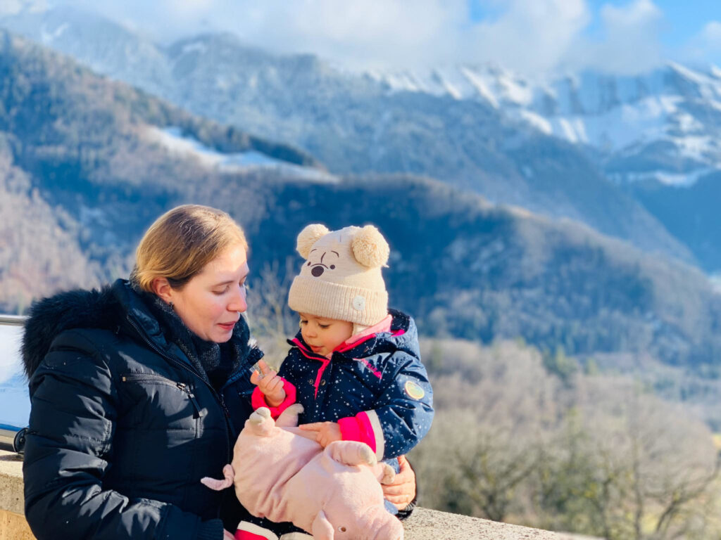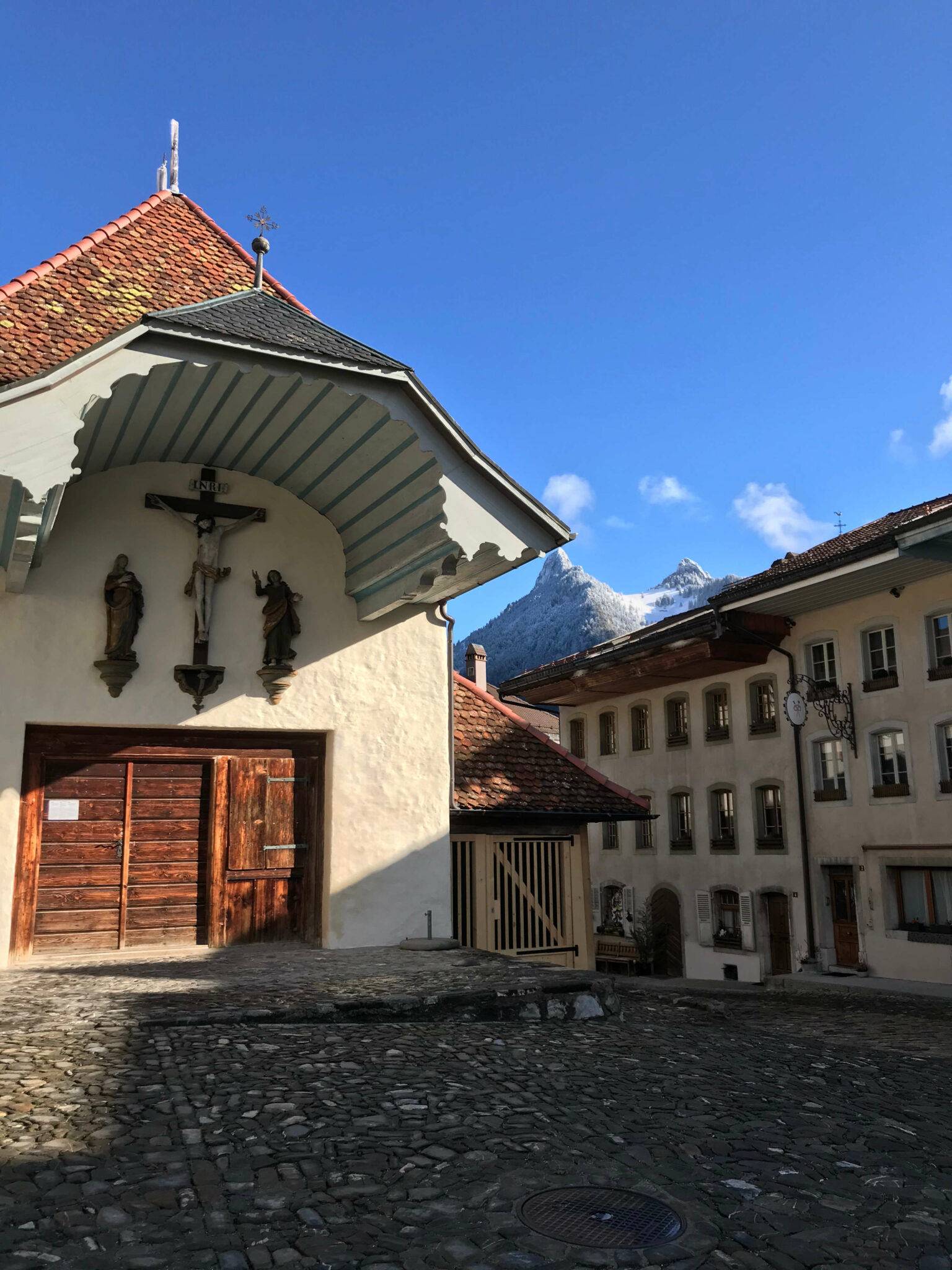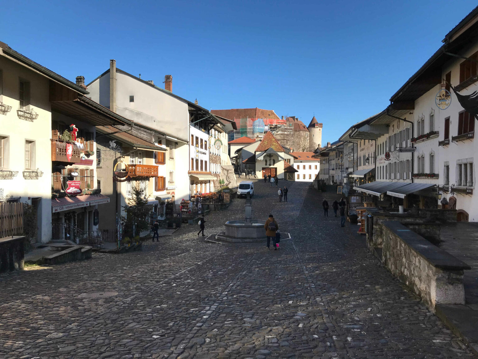 De Bulle, seguimos com outro trem até a estação Gruyères gare, localizada ao pé da colina onde está a vila de Gruyéres. Para chegar à Vila pode-se caminhar (por cerca de 15 – 20 minutos), ou pegar um ônibus até a “Gruyéres Ville”. Optamos pelo ônibus (viajantes com bebês entenderão que empurrar um carrinho colina acima não é muito fácil, e somando a temperatura externa abaixo de 5 graus, torna a missão ainda mais impossível).