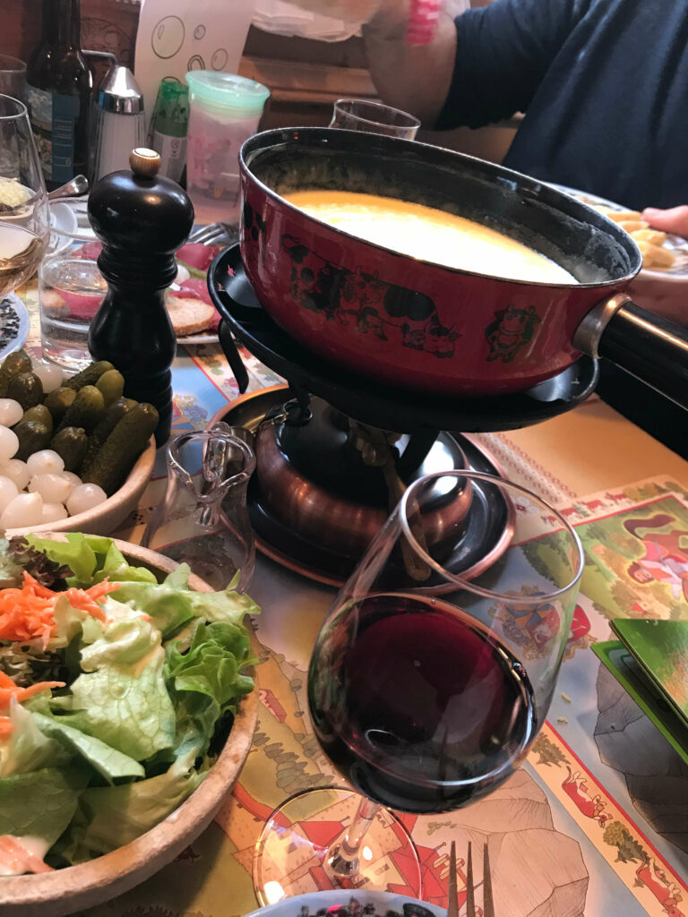 Chegamos próximo ao meio dia, então após uma caminhada para tirar algumas fotos no centro histórico (bem pequeno por sinal), fomos almoçar no Le Chalet. A escolha não poderia ser outra: fondue com o famoso queijo Gruyére.