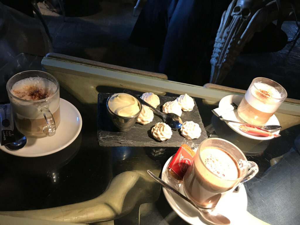 Com um design e arquitetura único, e iluminação (ou ausência dela), propícia para o clima do personagem do bar, o local é mais convidativo a um drink do que a um café, mas resolvemos insistir na bebida e aproveitar para descansar um pouco as pernas depois da caminhada no castelo. Optamos por um cappuccino.