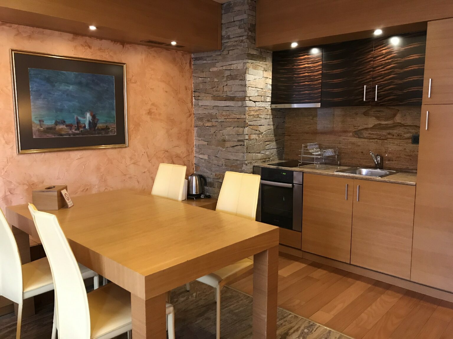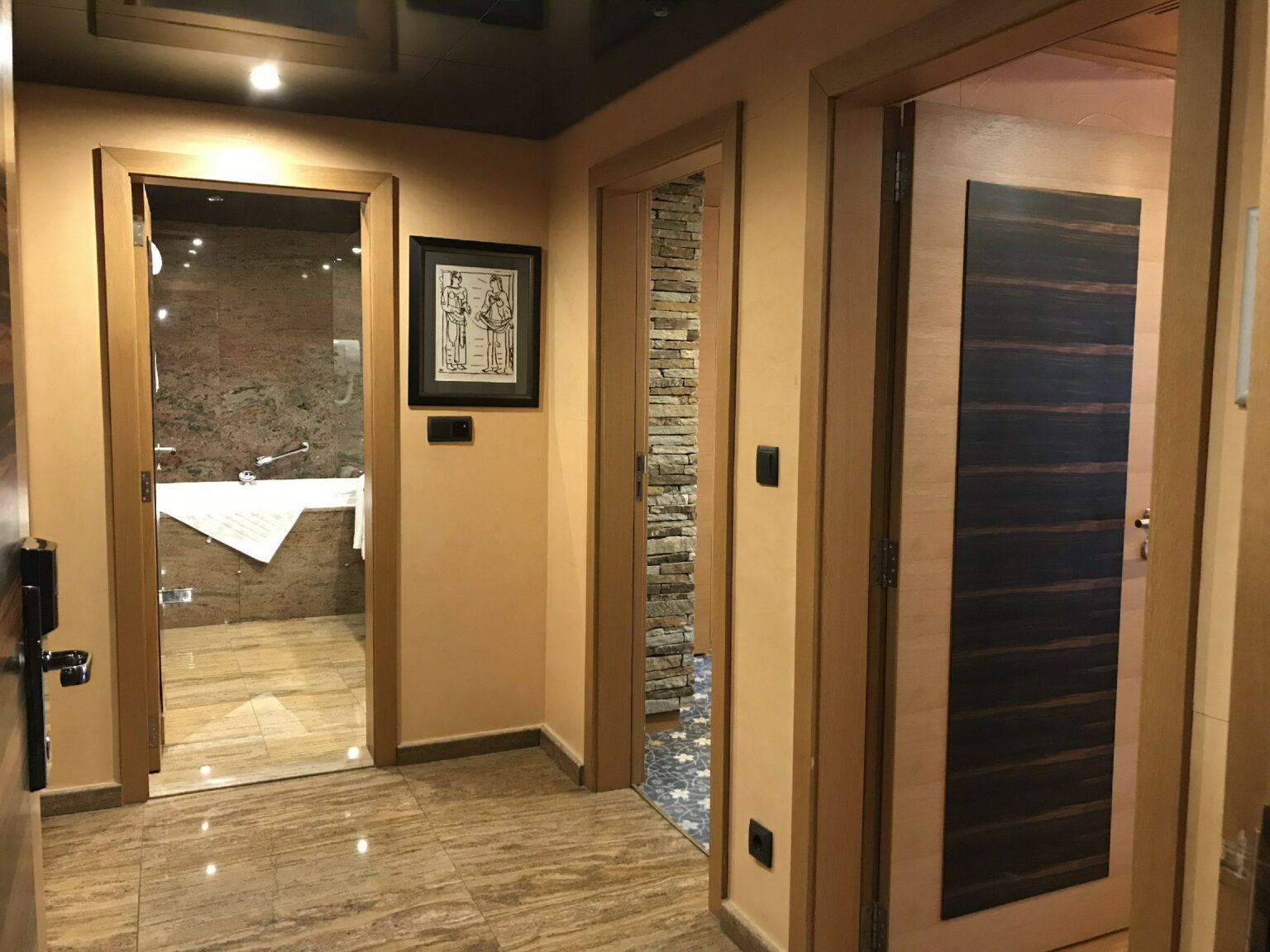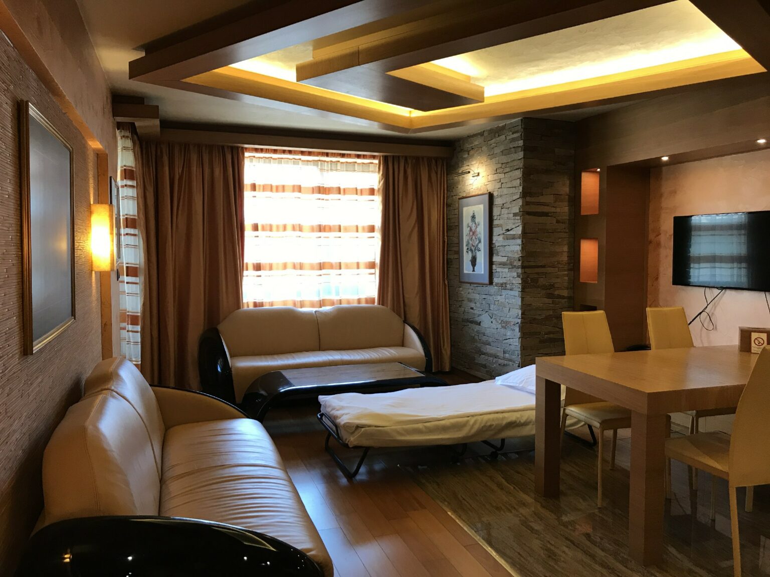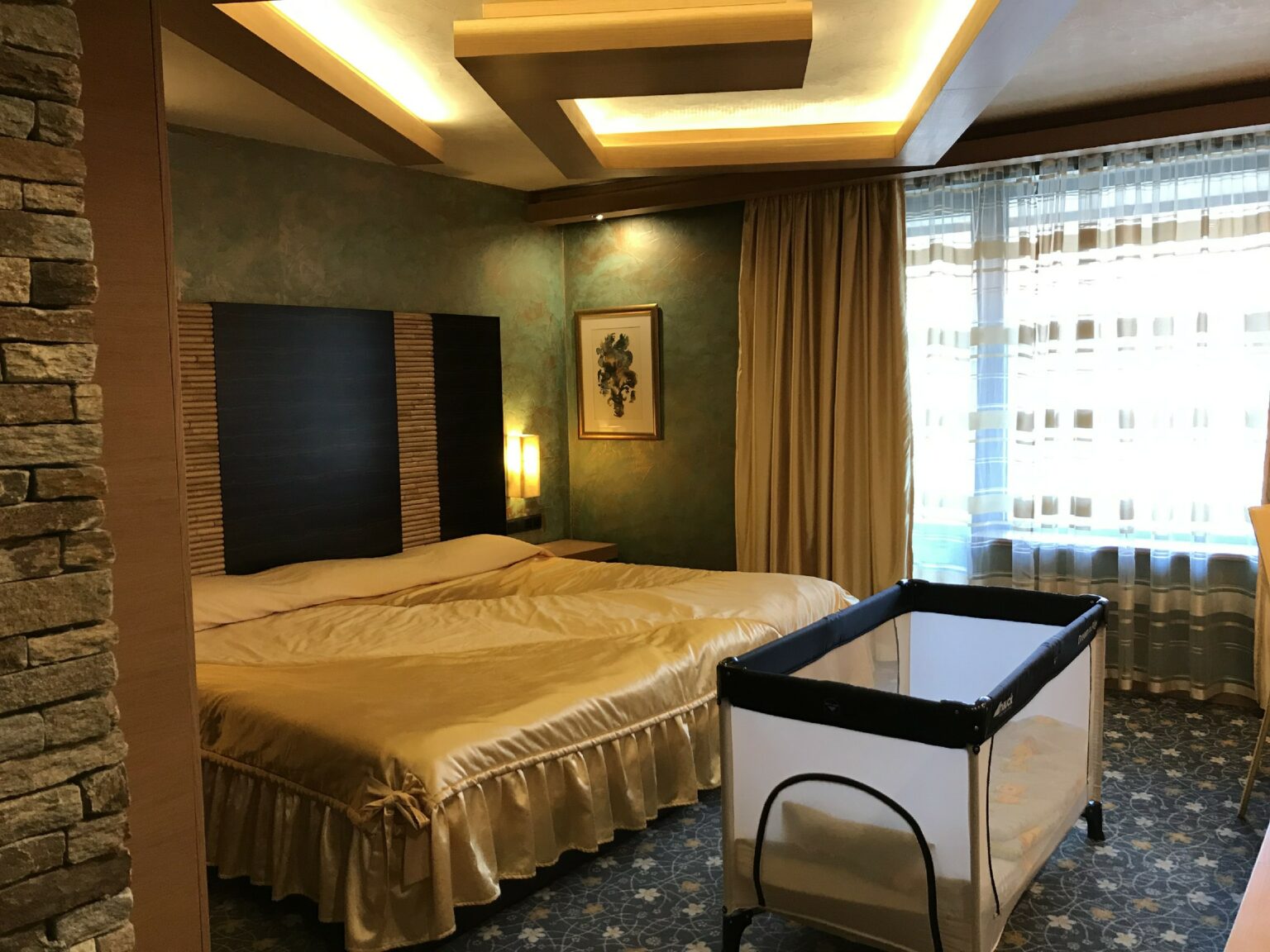 Do aeroporto de Sofia até o centro da cidade pegamos um trem. Esse trajeto levou cerca de 50 minutos. Descemos na estação mais próxima do hotel, com malas e carrinho de bebê, procurei um elevador. Felicidade total ao encontrar um (não são todas as estações que possuem elevadores!) mas levei cerca de 10 minutos para eu conseguir fazer o elevador funcionar. Sorte novamente! Fui auxiliada por uma adolescente que se compadeceu da minha situação. Além de ser um elevador antigo, era necessário apertar o segundo botão para que ele funcionasse e nos levasse até a altura da rua. Ficamos em um hotel butique: Hotel Anel. O hotel era repleto de obras de arte: diversas esculturas e quadros preenchiam os corredores. Até os quartos possuíam quadros. Aliás, o quarto foi uma agradável surpresa. Foi o maior quarto que já fique de todos os hotéis que frequentei até hoje.