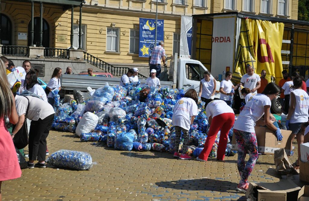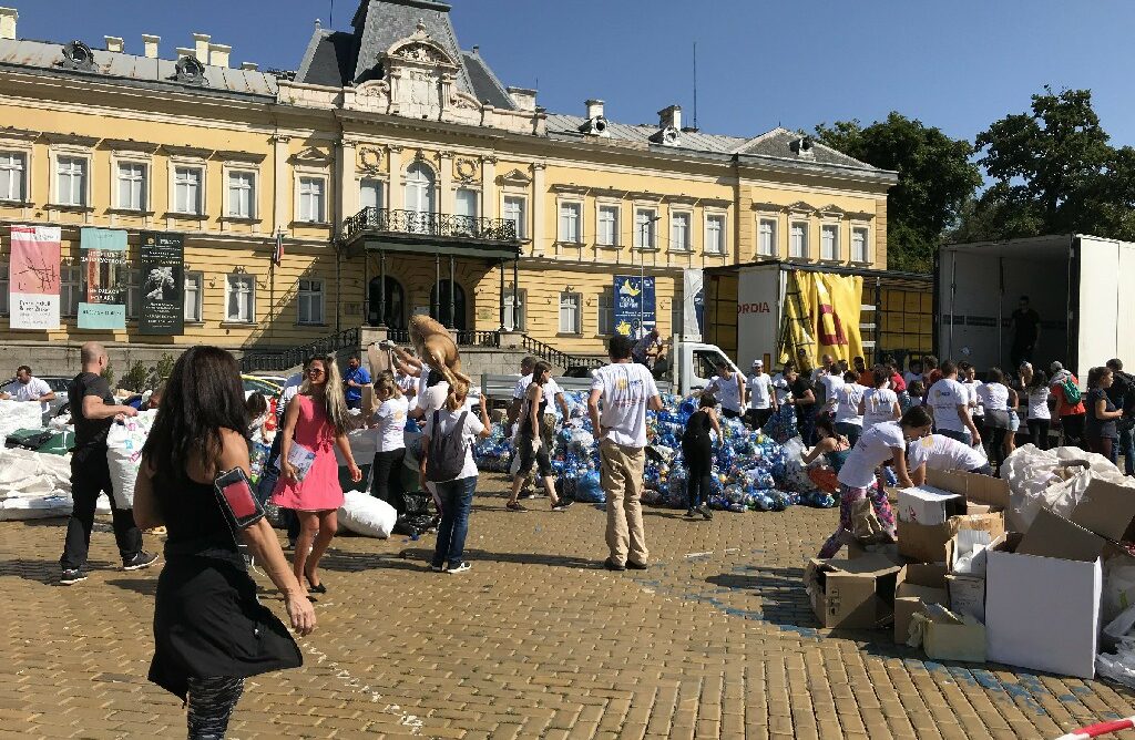 Pessoas na praça para entrega de tampinhas plásticas